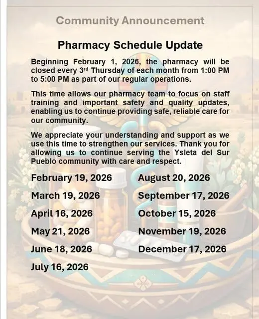 Effective February 1, 2026, the pharmacy will be closed every 3rd Thursday of each month from 1pm – 5pm.